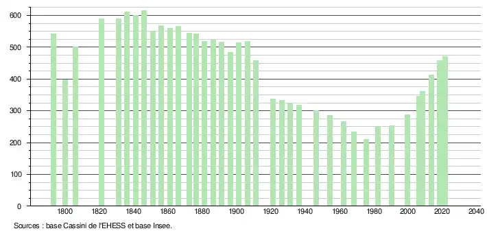 L'évolution du nombre d'habitants est connue à travers les recensements de la population effectués dans la commune depuis 1793. Pour les communes de moins de 10 000 habitants, une enquête de recensement portant sur toute la population est réalisée tous les cinq ans, les populations légales des années intermédiaires étant quant à elles estimées par interpolation ou extrapolation[28]. Pour la commune, le premier recensement exhaustif entrant dans le cadre du nouveau dispositif a été réalisé en 2008[29].