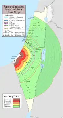 Les groupes palestiniens ont aussi récemment commencé à utiliser des roquettes Grad de type Katioucha qui ont une portée allant de 20 à 40 kilomètres. Elles sont importées via les tunnels entre l’Égypte et Gaza. Certaines de ces roquettes ont été produites en Iran et ont été spécialement conçues pour être acheminées par ces tunnels[2]. En novembre 2012 lors de l'Opération Pilier de défense des roquettes iraniennes Fajr 5 d’une portée moyenne de 75 km sont tirées pour la première fois et atteignent les environs de Jérusalem et de Bethléem dans les Territoires palestiniens causant de légers dégâts dans un village palestinien ainsi que Tel Aviv et sa périphérie[12],[13]. Matthew Levitt, considère dans un article publié par The Daily Beast que « non seulement le Hamas et autres factions avaient amassés des arsenaux de quelque 10.000 roquettes, mais que le Hamas avait apporté des améliorations significatives qui augmentent la portée et la précision et des charges utiles de ses roquettes fabriquées localement ». Il a estimé « qu'Israël avait détruit la plupart de cet armement, ainsi que des rampes de lancement, des laboratoires de production et centres de commandement et de contrôle » lors de cette opération[14].