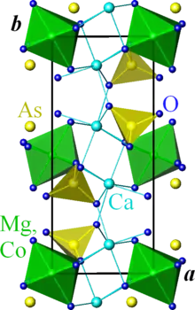 Les cations Mg2+ et Co2+ sont distribués sur un site d'occupation mixte et ont une coordination 6 d'anions O2−. Leur polyèdre de coordination est un octaèdre déformé (Co,Mg)O6, avec une longueur de liaison (Co,Mg)-O moyenne de 2,10 Å et des angles de liaison O-(Co,Mg)-O entre 83,22° et 96,78°. Les octaèdres (Co,Mg)O6 partagent leurs sommets avec quatre tétraèdres AsO4 et quatre arêtes avec quatre groupes CaO7.