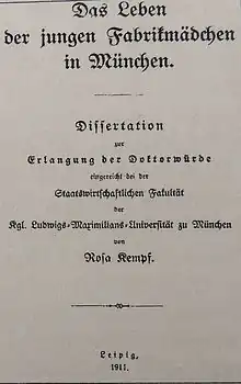 Le Land de Bavière autorisant depuis 1903 l'accès des femmes à l'université, Rosa Kempf s'inscrit à l'Université de Munich à l'âge de 31 ans. Elle étudie la philosophie et les sciences politiques et obtient un doctorat en 1911, avec une thèse supervisée par Lujo Brentano[3],[1]. Bien que celui-ci soit plus que réticent à l'entrée des femmes dans les universités (« Les auditrices sont pour moi une abomination, elles ne savent rien et ne comprennent rien, elles ne se soucient que d’aller à l’université »), il juge la thèse de Rosa Kempf « tout aussi remarquable sur le plan scientifique que rédactionnel » et estime que son élève a « un cœur sain, chaleureux et sensible et en même temps un esprit sobre et pratique »[3]. La thèse intitulée : « La vie des jeunes ouvrières à Munich. La situation sociale et économique de leur famille, leur vie professionnelle et leur situation personnelle. Selon des enquêtes statistiques, portant sur la situation de 270 ouvrières d'usine âgées de 14 à 18 ans » est un des premiers travaux de recherche sociale empirique[2].