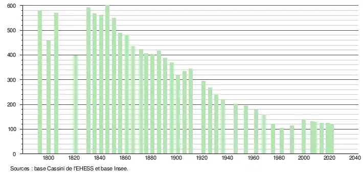 L'évolution du nombre d'habitants est connue à travers les recensements de la population effectués dans la commune depuis 1793. Pour les communes de moins de 10 000 habitants, une enquête de recensement portant sur toute la population est réalisée tous les cinq ans, les populations légales des années intermédiaires étant quant à elles estimées par interpolation ou extrapolation[16]. Pour la commune, le premier recensement exhaustif entrant dans le cadre du nouveau dispositif a été réalisé en 2008[17].