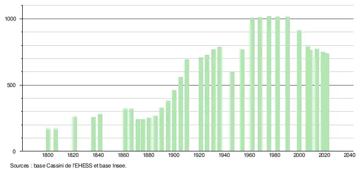 L'évolution du nombre d'habitants est connue à travers les recensements de la population effectués dans la commune depuis 1800. Pour les communes de moins de 10 000 habitants, une enquête de recensement portant sur toute la population est réalisée tous les cinq ans, les populations légales des années intermédiaires étant quant à elles estimées par interpolation ou extrapolation[22]. Pour la commune, le premier recensement exhaustif entrant dans le cadre du nouveau dispositif a été réalisé en 2008[23].