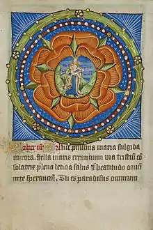 On trouve cette louange dans les poésies, les mots et une séquence liturgique : « Maria, rosa sine spina », « Marie, rose sans épines ». On la trouve dans la séquence grégorienne du 4e samedi de carême : « Reine de Vierges, Rose sans épines, vous êtes devenue la Mère de celui qui est Soleil et Rosée, Pain et Pasteur[25] », puis en Angleterre, dont la rose est le symbole, des motets, des chants de Noël, depuis le XIIIe siècle et ensuite dans des poésies religieuses, les polyphonies du lyrisme italien de la Renaissance.