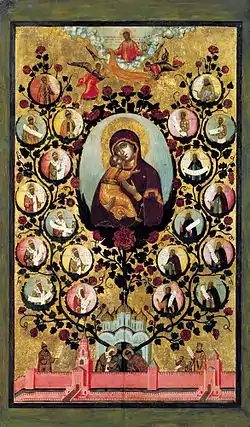 Une icône russe célèbre, Notre-Dame Joie des Affligés, représente la Vierge Marie dans un jardin de fleurs, tenant une fleur (une rose ?) à la main et protégeant depuis cet Éden céleste les hommes sous son manteau. Une autre icône de Simon Ouchakov représente Marie sur une rose rouge, croissant comme un rosier au-dessus de la ville de Moscou (cf Illustration à droite).