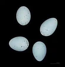 Le nid est construit assez bas dans un buisson. La ponte comporte cinq œufs de couleur bleu maculés de taches brun foncé.