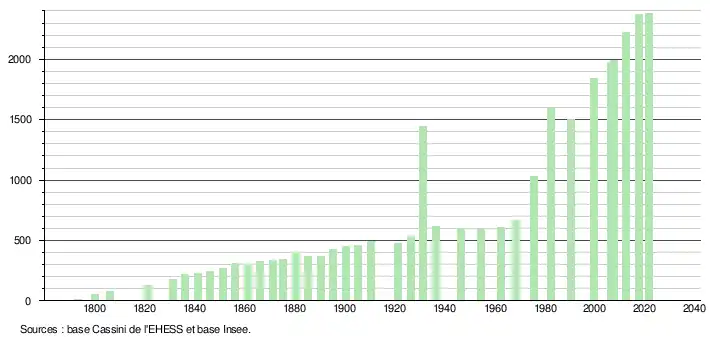L'évolution du nombre d'habitants est connue à travers les recensements de la population effectués dans la commune depuis 1793. Pour les communes de moins de 10 000 habitants, une enquête de recensement portant sur toute la population est réalisée tous les cinq ans, les populations légales des années intermédiaires étant quant à elles estimées par interpolation ou extrapolation[19]. Pour la commune, le premier recensement exhaustif entrant dans le cadre du nouveau dispositif a été réalisé en 2007[20].