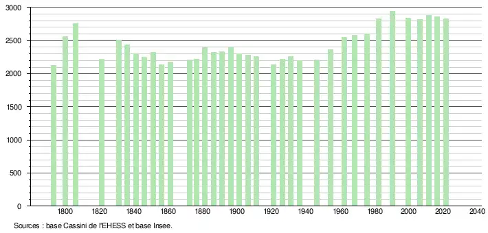 L'évolution du nombre d'habitants est connue à travers les recensements de la population effectués dans la commune depuis 1793. Pour les communes de moins de 10 000 habitants, une enquête de recensement portant sur toute la population est réalisée tous les cinq ans, les populations légales des années intermédiaires étant quant à elles estimées par interpolation ou extrapolation[26]. Pour la commune, le premier recensement exhaustif entrant dans le cadre du nouveau dispositif a été réalisé en 2006[27].