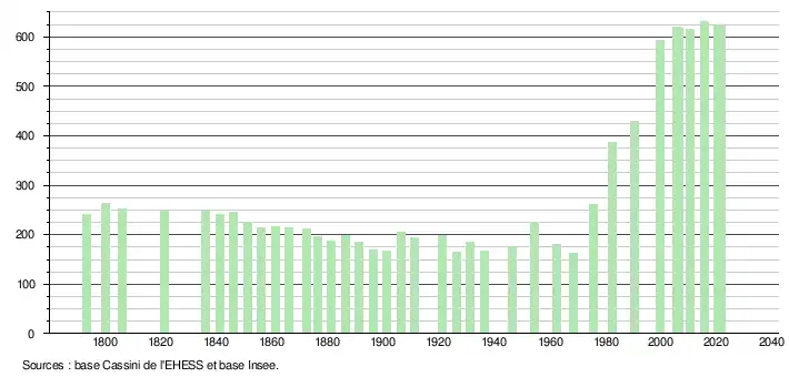 L'évolution du nombre d'habitants est connue à travers les recensements de la population effectués dans la commune depuis 1793. Pour les communes de moins de 10 000 habitants, une enquête de recensement portant sur toute la population est réalisée tous les cinq ans, les populations légales des années intermédiaires étant quant à elles estimées par interpolation ou extrapolation[34]. Pour la commune, le premier recensement exhaustif entrant dans le cadre du nouveau dispositif a été réalisé en 2005[35].