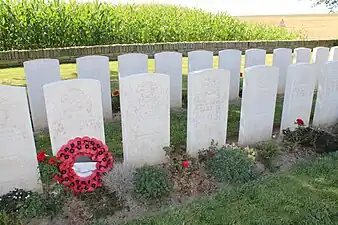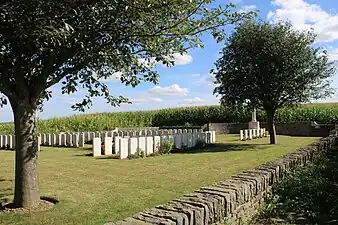 Le cimetière contient 41 sépultures du Commonwealth de la Première Guerre mondiale, dont deux non identifiées. Il y a aussi 70 sépultures de guerre allemandes, dont 42 non identifiées, disposées en sept rangées de dix tombes dans la partie est du cimetière et qui ont été apportées après l'armistice des champs de bataille immédiatement au sud et au sud-ouest du cimetière.
