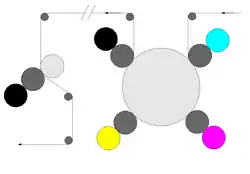 En effet, dans un procédé avec accumulation, la feuille n'est pas éjectée tout de suite. Elle est conservée et au tour suivant se trouvera dernière une autre. Ce qui permet de faire deux cahiers (par exemple à l'intérieur d'un quotidien, on aura un supplément sport). Sur le schéma : en rouge le papier qui est accumulé est éjecté avec une autre feuille.