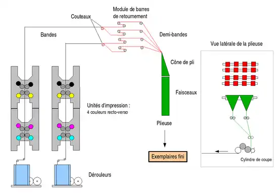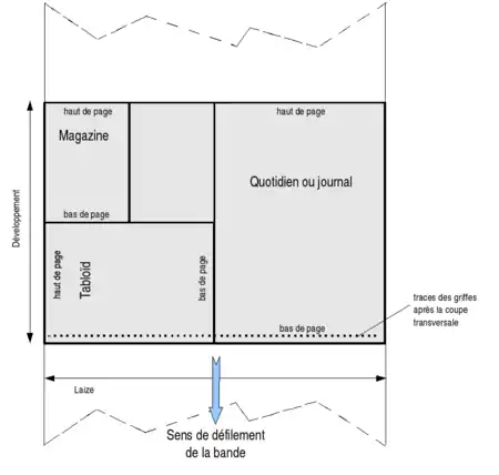 Sur une presse rotative, la circonférence des cylindres (développement) détermine le format du papier et donc la hauteur maximale de la page. Pour accéder à d'autres formats, il est nécessaire de couper le papier longitudinalement, puis l'on a recours à divers types de pliures.