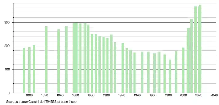 L'évolution du nombre d'habitants est connue à travers les recensements de la population effectués dans la commune depuis 1793. Pour les communes de moins de 10 000 habitants, une enquête de recensement portant sur toute la population est réalisée tous les cinq ans, les populations légales des années intermédiaires étant quant à elles estimées par interpolation ou extrapolation[13]. Pour la commune, le premier recensement exhaustif entrant dans le cadre du nouveau dispositif a été réalisé en 2005[14].