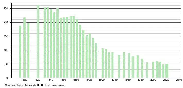 L'évolution du nombre d'habitants est connue à travers les recensements de la population effectués dans la commune depuis 1793. Pour les communes de moins de 10 000 habitants, une enquête de recensement portant sur toute la population est réalisée tous les cinq ans, les populations légales des années intermédiaires étant quant à elles estimées par interpolation ou extrapolation[14]. Pour la commune, le premier recensement exhaustif entrant dans le cadre du nouveau dispositif a été réalisé en 2005[15].