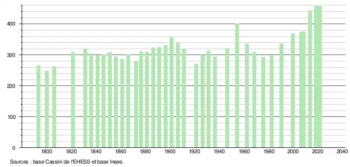L'évolution du nombre d'habitants est connue à travers les recensements de la population effectués dans la commune depuis 1793. Pour les communes de moins de 10 000 habitants, une enquête de recensement portant sur toute la population est réalisée tous les cinq ans, les populations légales des années intermédiaires étant quant à elles estimées par interpolation ou extrapolation[22]. Pour la commune, le premier recensement exhaustif entrant dans le cadre du nouveau dispositif a été réalisé en 2008[23].