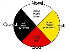 « Le cercle de vie est séparé en quatre parties égales qui représentent chacune une direction différente. Une couleur est associée à chacune de ces parties. Au centre de ce cercle, il y a la Terre aussi appelée le tout ou le grand Mystère. Chaque direction est également associée à un aspect de l’humain ainsi qu’à une saison.