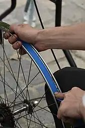Si la surface de la jante en contact avec la chambre à air a des trous pour rayons, on doit les couvrir avec un fond de jante, en général en caoutchouc, en tissu ou en plastique rigide, pour protéger la chambre.