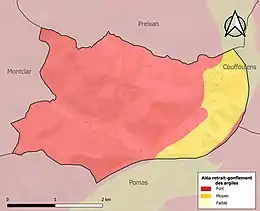 Le retrait-gonflement des sols argileux est susceptible d'engendrer des dommages importants aux bâtiments en cas d’alternance de périodes de sécheresse et de pluie. La totalité de la commune est en aléa moyen ou fort (75,2 % au niveau départemental et 48,5 % au niveau national). Sur les 206 bâtiments dénombrés sur la commune en 2019, 206 sont en aléa moyen ou fort, soit 100 %, à comparer aux 94 % au niveau départemental et 54 % au niveau national. Une cartographie de l'exposition du territoire national au retrait gonflement des sols argileux est disponible sur le site du BRGM[24],[Carte 3].