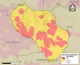 Le retrait-gonflement des sols argileux est susceptible d'engendrer des dommages importants aux bâtiments en cas d’alternance de périodes de sécheresse et de pluie. La totalité de la commune est en aléa moyen ou fort (67,7 % au niveau départemental et 48,5 % au niveau national). Sur les 199 bâtiments dénombrés sur la commune en 2019, 198 sont en aléa moyen ou fort, soit 99 %, à comparer aux 72 % au niveau départemental et 54 % au niveau national. Une cartographie de l'exposition du territoire national au retrait gonflement des sols argileux est disponible sur le site du BRGM[21],[Carte 2].