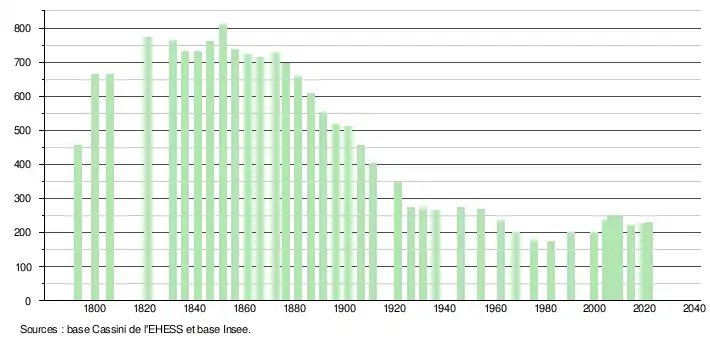 L'évolution du nombre d'habitants est connue à travers les recensements de la population effectués dans la commune depuis 1793. Pour les communes de moins de 10 000 habitants, une enquête de recensement portant sur toute la population est réalisée tous les cinq ans, les populations légales des années intermédiaires étant quant à elles estimées par interpolation ou extrapolation[31]. Pour la commune, le premier recensement exhaustif entrant dans le cadre du nouveau dispositif a été réalisé en 2004[32].