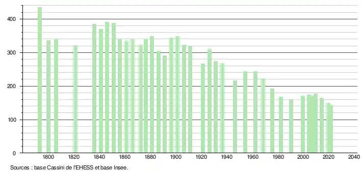 L'évolution du nombre d'habitants est connue à travers les recensements de la population effectués dans la commune depuis 1793. Pour les communes de moins de 10 000 habitants, une enquête de recensement portant sur toute la population est réalisée tous les cinq ans, les populations légales des années intermédiaires étant quant à elles estimées par interpolation ou extrapolation[27]. Pour la commune, le premier recensement exhaustif entrant dans le cadre du nouveau dispositif a été réalisé en 2004[28].