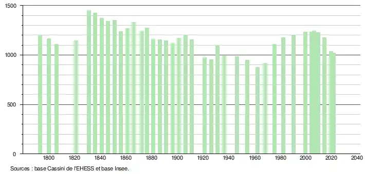 L'évolution du nombre d'habitants est connue à travers les recensements de la population effectués dans la commune depuis 1793. Pour les communes de moins de 10 000 habitants, une enquête de recensement portant sur toute la population est réalisée tous les cinq ans, les populations légales des années intermédiaires étant quant à elles estimées par interpolation ou extrapolation[22]. Pour la commune, le premier recensement exhaustif entrant dans le cadre du nouveau dispositif a été réalisé en 2004[23].