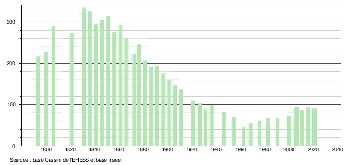 L'évolution du nombre d'habitants est connue à travers les recensements de la population effectués dans la commune depuis 1793. Pour les communes de moins de 10 000 habitants, une enquête de recensement portant sur toute la population est réalisée tous les cinq ans, les populations légales des années intermédiaires étant quant à elles estimées par interpolation ou extrapolation[17]. Pour la commune, le premier recensement exhaustif entrant dans le cadre du nouveau dispositif a été réalisé en 2005[18].