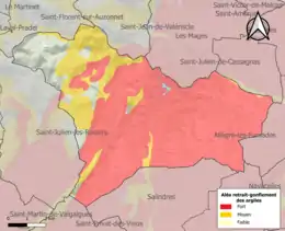 La commune est vulnérable au risque de mouvements de terrains constitué principalement du retrait-gonflement des sols argileux[21]. Cet aléa est susceptible d'engendrer des dommages importants aux bâtiments en cas d’alternance de périodes de sécheresse et de pluie. 88,7 % de la superficie communale est en aléa moyen ou fort (67,5 % au niveau départemental et 48,5 % au niveau national). Sur les 1 686 bâtiments dénombrés sur la commune en 2019, 1665 sont en aléa moyen ou fort, soit 99 %, à comparer aux 90 % au niveau départemental et 54 % au niveau national. Une cartographie de l'exposition du territoire national au retrait gonflement des sols argileux est disponible sur le site du BRGM[22],[Carte 2].