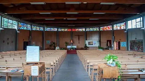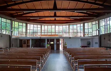 L'église possède un plan original, en ellipse. Le béton banché est laissé brut de décoffrage, ce qui permet un jeu d'alternance entre bandeaux verticaux et horizontaux. L'espace intérieur est complètement dégagé, éclairé par un bandeau de vitraux colorés qui en fait le tour, et couvert d'une charpente en bois lamellé-collé[6].