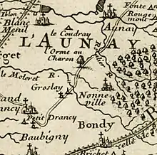 - À l'angle de la rue de la Division-Leclerc et au sud de la rue Alix, la seigneurie de Nonneville[8]. La ferme qui s'y trouvait[9] faisait partie de la seigneurie de Nonneville acquise en 1493 par Jacques Coitier[10].