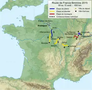L'édition 2015 part d'Enghien-les-Bains dans le Val-d'Oise et passe entre autres par les villes de Bourges, Nevers et Autun pour finir en Alsace à Guebwiller. Cette édition propose une étape bien plus vallonnée que les deux années précédentes, puisque la cinquième étape a pris son envol à Vesoul et est passée par le col des Chevrères pour finir à La Planche des Belles Filles, sommet du massif des Vosges culminant à 1 148 mètres d'altitude.