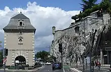 - Située au début de la route de Lyon, à l'entrée sud de l'Esplanade, la porte de France est un des éléments de la fortification de la colline de la Bastille érigée par le duc de Lesdiguières en 1620[8].
