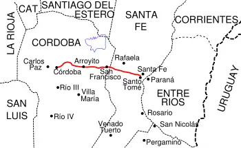 Depuis son intersection avec la route nationale 11 à Santo Tomé en province de Santa Fe, jusqu'à sa liaison avec la route nationale 9 à Córdoba, elle parcourt 337 km totalement asphaltés, et numérotés du km 0 au km 337.