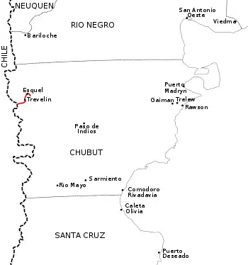 - Département de Futaleufú: Esquel (km 9-13), Trevelín (km 35-37) et Los Cipreses (km 64).