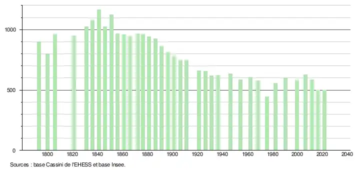 L'évolution du nombre d'habitants est connue à travers les recensements de la population effectués dans la commune depuis 1793. Pour les communes de moins de 10 000 habitants, une enquête de recensement portant sur toute la population est réalisée tous les cinq ans, les populations légales des années intermédiaires étant quant à elles estimées par interpolation ou extrapolation[13]. Pour la commune, le premier recensement exhaustif entrant dans le cadre du nouveau dispositif a été réalisé en 2006[14].