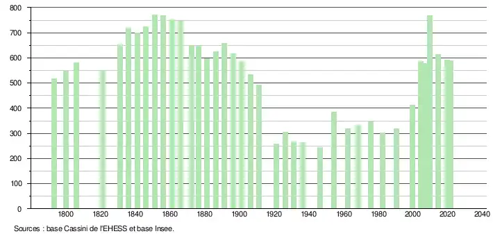 L'évolution du nombre d'habitants est connue à travers les recensements de la population effectués dans la commune depuis 1793. Pour les communes de moins de 10 000 habitants, une enquête de recensement portant sur toute la population est réalisée tous les cinq ans, les populations légales des années intermédiaires étant quant à elles estimées par interpolation ou extrapolation[15]. Pour la commune, le premier recensement exhaustif entrant dans le cadre du nouveau dispositif a été réalisé en 2004[16].