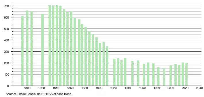 L'évolution du nombre d'habitants est connue à travers les recensements de la population effectués dans la commune depuis 1793. Pour les communes de moins de 10 000 habitants, une enquête de recensement portant sur toute la population est réalisée tous les cinq ans, les populations légales des années intermédiaires étant quant à elles estimées par interpolation ou extrapolation[17]. Pour la commune, le premier recensement exhaustif entrant dans le cadre du nouveau dispositif a été réalisé en 2006[18].