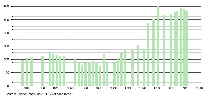L'évolution du nombre d'habitants est connue à travers les recensements de la population effectués dans la commune depuis 1793. Pour les communes de moins de 10 000 habitants, une enquête de recensement portant sur toute la population est réalisée tous les cinq ans, les populations légales des années intermédiaires étant quant à elles estimées par interpolation ou extrapolation[18]. Pour la commune, le premier recensement exhaustif entrant dans le cadre du nouveau dispositif a été réalisé en 2008[19].