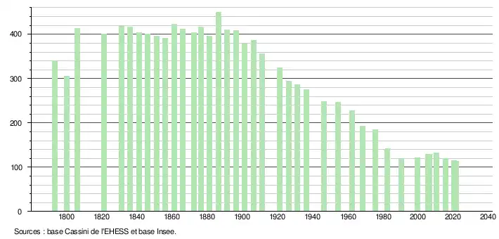 L'évolution du nombre d'habitants est connue à travers les recensements de la population effectués dans la commune depuis 1793. Pour les communes de moins de 10 000 habitants, une enquête de recensement portant sur toute la population est réalisée tous les cinq ans, les populations légales des années intermédiaires étant quant à elles estimées par interpolation ou extrapolation[14]. Pour la commune, le premier recensement exhaustif entrant dans le cadre du nouveau dispositif a été réalisé en 2005[15].