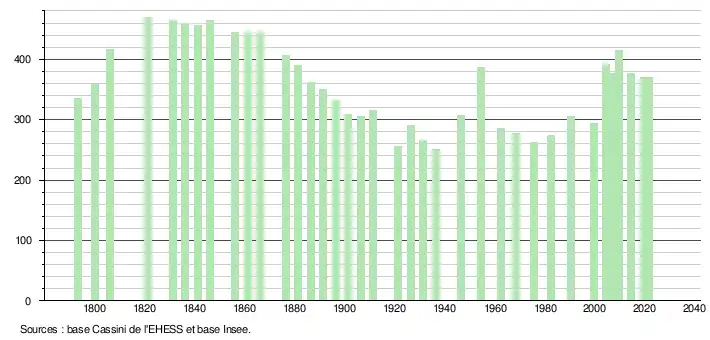 L'évolution du nombre d'habitants est connue à travers les recensements de la population effectués dans la commune depuis 1793. Pour les communes de moins de 10 000 habitants, une enquête de recensement portant sur toute la population est réalisée tous les cinq ans, les populations légales des années intermédiaires étant quant à elles estimées par interpolation ou extrapolation[21]. Pour la commune, le premier recensement exhaustif entrant dans le cadre du nouveau dispositif a été réalisé en 2004[22].