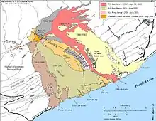 Carte des coulées de lave du Puʻu ʻŌʻō en décembre 2008 montrant l'encerclement et la destruction partielle de Royal Gardens subdivision.