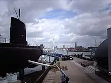 - Le HMS Alliance : un sous-marin chasseur-tueur de la classe Amphion d’après-guerre, maintenant sorti de l’eau et placé sur pilotis ;