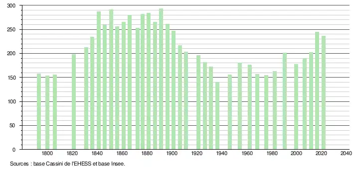 L'évolution du nombre d'habitants est connue à travers les recensements de la population effectués dans la commune depuis 1793. Pour les communes de moins de 10 000 habitants, une enquête de recensement portant sur toute la population est réalisée tous les cinq ans, les populations légales des années intermédiaires étant quant à elles estimées par interpolation ou extrapolation[29]. Pour la commune, le premier recensement exhaustif entrant dans le cadre du nouveau dispositif a été réalisé en 2006[30].