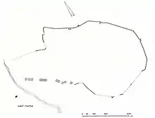 La superficie initiale de la ville est alors estimée à 13-16 hectares. Enfin, un grand édifice à l’ouest, comporte un puissant soubassement surmonté des vestiges d’une salle à piliers et muni de deux tours ; il s’agit très certainement d’un sanctuaire extra-muros.