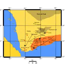 Sa capitale Hagar Yahirr, dans le nord du Wadi Markha, à l'est du Wadi Bayhan, est aujourd'hui marquée presque uniquement par un monticule artificiel, localement nommé Agar Asfal, vers 990 mètres d'altitude. Elle semble avoir été détruite au VIIe siècle avant notre ère par le roi et mukarrib de Saba Karib'il Watar, selon un texte sabéen dans des termes qui témoignent de son importance pour les Sabéens.