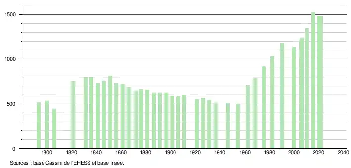 L'évolution du nombre d'habitants est connue à travers les recensements de la population effectués dans la commune depuis 1793. Pour les communes de moins de 10 000 habitants, une enquête de recensement portant sur toute la population est réalisée tous les cinq ans, les populations légales des années intermédiaires étant quant à elles estimées par interpolation ou extrapolation[31]. Pour la commune, le premier recensement exhaustif entrant dans le cadre du nouveau dispositif a été réalisé en 2005[32].