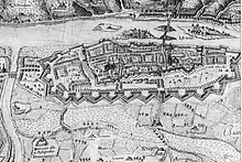 Le ruau Sainte-Anne, à gauche sur la carte de Georg Braun (1572). | |
