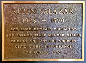 Plaque honorant la mémoire de Rubén Salazar, apposée sur la façade de l'immeuble du Los Angeles Times à Los Angeles.