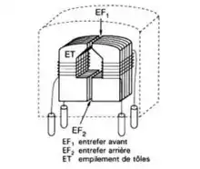 Exemple de réalisation : tête audiophonique. Ces têtes, très bon marché, sont généralement réalisées par empilement de tôles en fer doux pour réduire les courants induits dans le milieu magnétique (courants de Foucault). La résolution est faible (entrefer de 2 à 10 µm), la masse de cuivre du bobinage est très importante pour permettre la reproduction des basses fréquences.