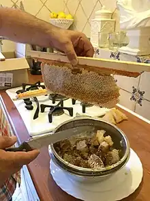 Un couteau, une passoire, un saladier suffisent à l'extraction du miel provenant d'un rayon de ruche horizontale.
