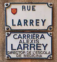 La rue est nommée en hommage au chirurgien Alexis Larrey[1]. Originaire de Beaudéan (Hautes-Pyrénées), il fait ses études de chirurgie à l'hôtel-Dieu Saint-Jacques, à Toulouse. En 1776, il devient chirurgien-major à l'hôpital de La Grave. En 1779, il accueille son neveu orphelin, Dominique Larrey, qui le quitte quelques années plus tard pour poursuivre ses études à Paris. Alexis Larrey s'affirme comme une des autorités médicales de la ville et il devient professeur d'obstétrique à l'École royale de chirurgie en 1792. Mais l'année suivante, l'université est supprimée par décret et l'enseignement de la médecine est bouleversé. Alexis Larrey reste professeur d'anatomie de l'enseignement provisoire toulousain, soutenue par l'administration départementale. Finalement, il est le premier directeur de l'École impériale de médecine de Toulouse, créée par le décret impérial de .